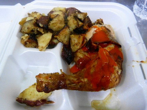 You can get a quarter rotisserie chicken for $2.75, or get it with a side and drink for $5.25. I tried to order just the chicken and a side, but was told I had to have a drink which annoyed me. There was some sketchy looking mac & cheese, corn, mixed vegetables, salad and roasted potatoes on offer as sides and I chose the last one. And since the chicken didn’t look super flavorful I opted for some hot sauce squirted on it, or you can get barbeque sauce.