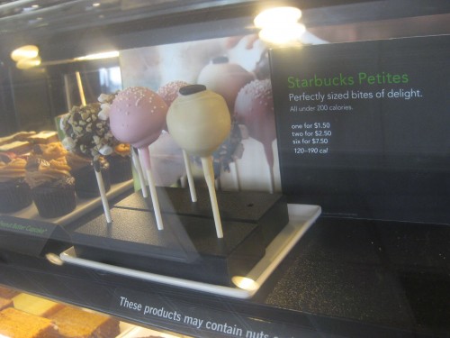 Starbucks petites include cake pops, mini cupcakes, and mini bars. One for $1.50 is a little high, but 2 for $2.50 is for some reason is acceptable to me.