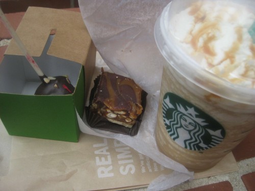 My 1/2 off medium caramel frapp, rocky road cake pop, and salted caramel bar only cost me $5, pretty decent.