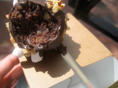 The cake pop was only ok but I loved its clever box that kept it from getting smushed. The salted caramel bar was actually really lovely, a layer of cookie, a layer of fudge with pretzels in it (which could have stood to be crunchier), and a drizzle of sweet and salty caramel on top. Sugar rush!