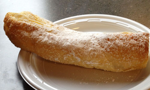 Later, I ordered up a cheese stick ($2.75). Swiss Haus describes it as a flaky pastry filled with sweet cream cheese. That’s pretty accurate. It was very light (weight-wise) and airy, and the cheese was quite soft. The main issue with the cheese stick? It’s a little messy to eat because the soft flakes fall off.