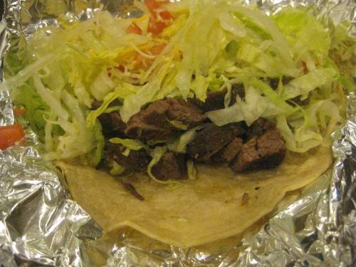 Tacos are bigger than your average and prepared in the American style; with lettuce and tomato. A steak taco ($2.70) had well seasoned meat, but was a little overcooked.